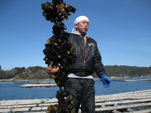 慰霊音楽祭の翌日は、「おばか隊」の一員として島の復興に尽力され、いつも私達が大島に行く度に大変お世話になっている小松俊浩さんに、カキ・ホタテ養殖の現場を案内して頂きました。